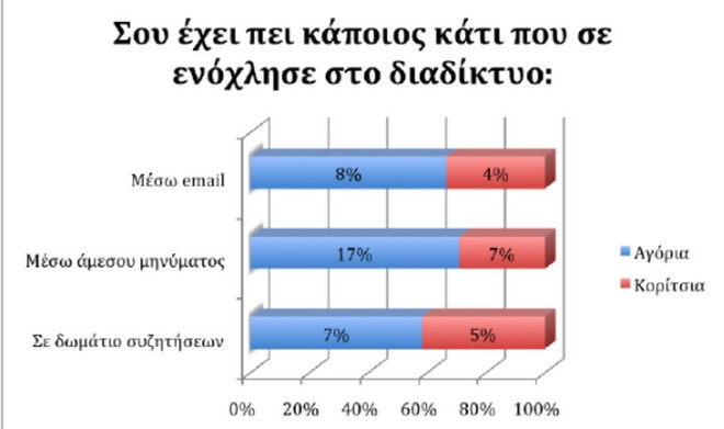 Η πλειοψηφία των παιδιών δήλωσε πως δεν έχει πέσει θύμα παρενόχλησης μέσω email, άμεσου μηνύματος ή σε chat rooms. Όσοι απάντησαν θετικά, σύμφωνα με τους ειδικούς ” οφείλουμε να εξετάσουμε με μεγαλύτερη λεπτομέρεια, τι είναι αυτό ακριβώς που τους ενόχλησε. Πρέπει να εξεταστεί σε ποιο βαθμό η εμπειρία στο διαδίκτυο είναι απόρροια της δια ζώσης εμπειρίας του bullying“.