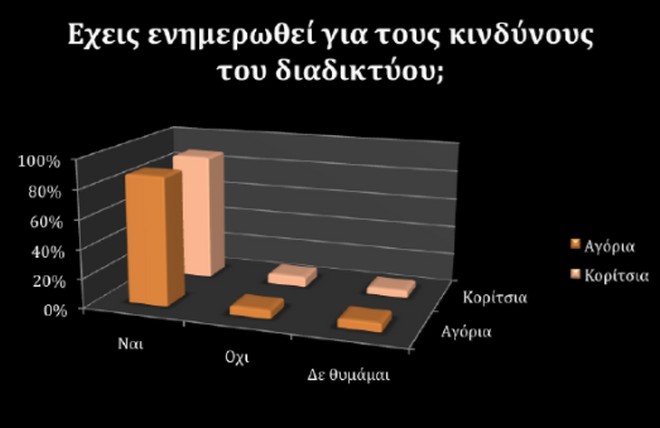 Η πλειοψηφία ανέφερε ότι έχει ενημερωθεί για το ενδεχόμενο οι εμπειρίες τους στο διαδίκτυο να είναι ριψοκίνδυνες, από γονείς και φίλους. Ανησυχητικό είναι το ποσοστό του “δεν θυμάμαι”, πολλώ δε αν σκεφτούμε πως συχνά τα παιδιά απαντούν ό,τι νομίζουμε πως θέλουμε να ακούσουμε από αυτά -και όχι ειλικρινά.