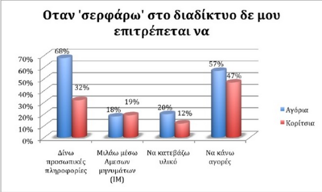 Ενδιαφέρον έχει να δείτε τι ανέφεραν τα παιδιά πως δεν τους επιτρέπεται να κάνουν, όταν βρίσκονται στο διαδίκτυο. Το 68% των αγοριών και το 75% των κοριτσιών δήλωσαν πως δεν τους επιτρέπεται να δίνουν προσωπικές πληροφορίες. Δεν ήταν όμως, αυτό το πρώτο πράγμα που τους είπαν οι γονείς. Τι ήταν; Να μην κάνουν διαδικτυακές αγορές και κάπως έτσι, φάνηκε πως οι γονείς στην Ελλάδα δίνουν προτεραιότητα στην αποφυγή της οικονομικής εξαπάτησης των παιδιών τους.