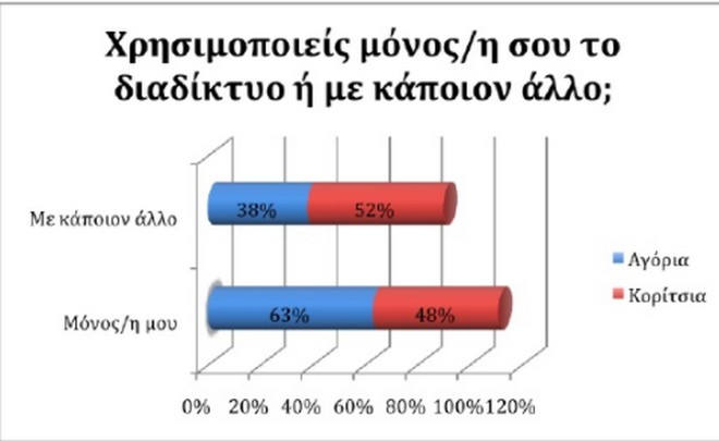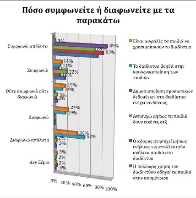 Το 92% των αγοριών και το 90% των κοριτσιών δήλωσαν πως δεν φοβάται μήπως περνά πολλές ώρες στο διαδίκτυο. Την ίδια ώρα, το 93% των γονέων θεωρεί πως η πολύωρη χρήση του διαδικτύου μπορεί να οδηγήσει τα παιδιά σε απομόνωση -από άλλους ανθρώπους.