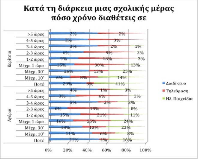Το 41% των κοριτσιών δήλωσε ότι δεν αφιερώνει καθόλου χρόνο σε ηλεκτρονικά παιχνίδια, σε μια σχολική ημέρα . Το αντίστοιχο ποσοστό των αγοριών ήταν το 16%. Τα αποτελέσματα έδειξαν επίσης, ότι τα αγόρια και τα κορίτσια αφιερώνουν μια με 2 ώρες, ημερησίως περισσότερο στο να παρακολουθούν τηλεόραση, από το να σερφάρουν στο διαδίκτυο. Αυτό γίνεται είτε γιατί οι γονείς περιορίζουν τη χρήση του διαδικτύου, είτε γιατί οι διαδικτυακές τους δεξιότητες είναι περιορισμένες, είτε διότι παρακολουθούν αγαπημένα τους προγράμματα.