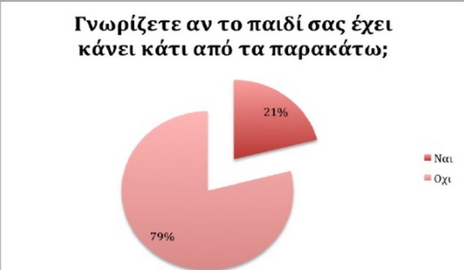 Το 79% των γονιών απάντησε πως ΔΕΝ ΓΝΩΡΙΖΕΙ αν το παιδί έχει 1) επισκεφτεί διαδικτυακά δωμάτια συζητήσεων, 2) αν έχει κάνει νέους φίλους από το διαδίκτυο, 3) αν έχει παρενοχληθεί από κάποιον, 4) αν έχει λάβει ανεπιθύμητα σεξουαλικά σχόλια, 5) αν έχει συναντήσει υλικό με σεξουαλικό περιεχόμενο, 6) αν έχει λάβει υλικό με σεξουαλικό περιεχόμενο, 7) αν έχει έλθει σε επαφή με βίαιο ή αποτρόπαιο ή ρατσιστικό υλικό, 8) αν έχει συναντήσει από κοντά κάποιον που γνωρίζει μόνο μέσω διαδικτύου και 9) αν έχει δώσει προσωπικές πληροφορίες στο διαδίκτυο. Μήπως τώρα, βλέπετε το πρόβλημα; Μια στιγμή να δούμε και τις απαντήσεις των παιδιών.
