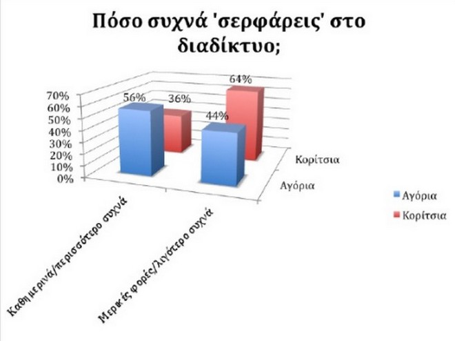 Τα αγόρια είναι περισσότερο “καθημερινοί χρήστες” του διαδικτύου, σε σχέση με τα κορίτσια. Το ποσοστό είναι 56% για τα αγόρια και 36% για τα κορίτσια. Τα παιδιά ανέφεραν πως την πρόσβαση και τη χρήση στο διαδίκτυο την έμαθαν, ως επί το πλείστον, με τη βοήθεια κάποιου άλλου (79% τα κορίτσια και 72% τα αγόρια). Δεν φάνηκε δηλαδή, να ξεκινούν μόνοι/μόνες τον πειραματισμό με το μέσο (21% τα κορίτσια, 28% τα αγόρια).