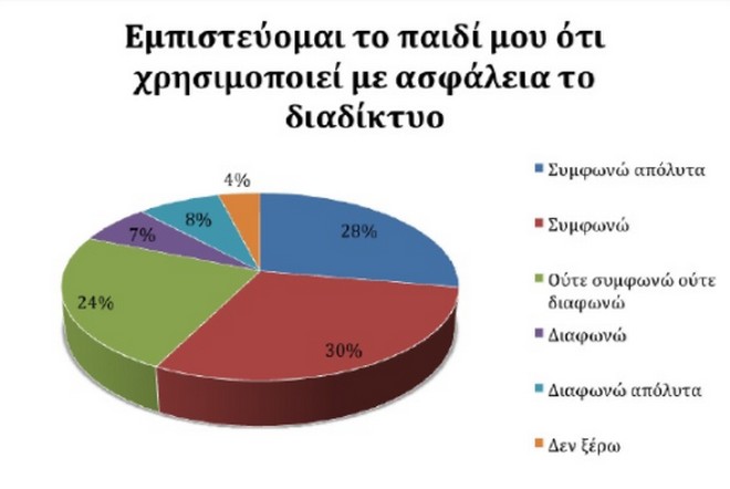 Σε επόμενη ερώτηση οι γονείς κλήθηκαν να πουν αν και πόσο εμπιστεύονται τα παιδιά τους πως χρησιμοποιούν το διαδίκτυο με ασφάλεια -σε συνάρτηση με τους κανόνες χρήσης των Μέσων και το βαθμό γονικής διαμεσολάβησης. Πολλοί απάντησαν πως όταν το παιδί τους χρησιμοποιεί το διαδίκτυο, θεωρούν τους εαυτούς τους αρκετά ικανούς να βοηθήσουν ή να συζητήσουν μαζί του για τη χρήση που κάνει. Αρκετοί γονείς είπαν πως βρίσκονται κοντά όταν το παιδί πλοηγείται στο διαδίκτυο (το 71% είπε “είμαστε στο ίδιο δωμάτιο” και μόνο το 29% ενημέρωσε πως επεμβαίνει πιο ενεργά, παρέχοντας βοήθεια και συζητώντας για την πλοήγηση”).
