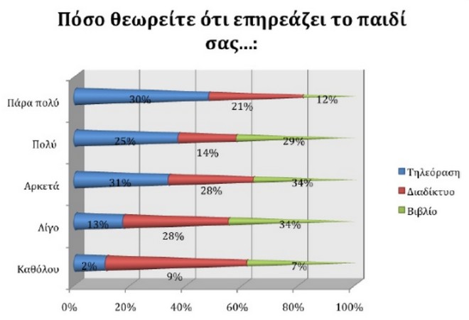 Οι ερευνητές τόνισαν ότι οι απαντήσεις αυτές βρίσκονται σε αντιπαράθεση, με τα στοιχεία που ακολουθούν (για το αν οι γονείς έχουν εμπιστοσύνη στα παιδιά τους, όταν χρησιμοποιούν το διαδίκτυο). Ενδιαφέρον έχει να δείτε και πόσο οι γονείς θεωρούν ότι επηρεάζει το παιδί τους το διαδίκτυο, σε σύγκριση με την τηλεόραση ή το βιβλίο. Και ναι, η τηλεόραση εξακολουθεί να είναι στο Νο1.