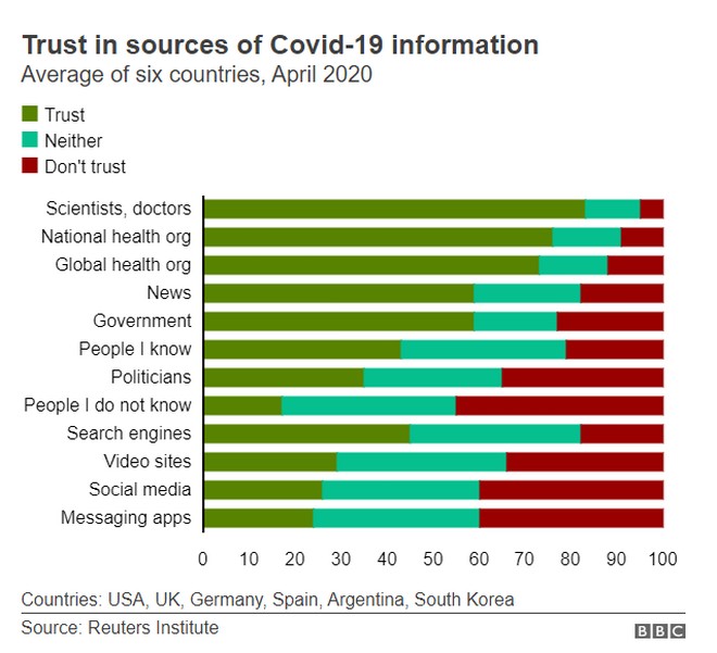 Αξίζει βέβαια να σημειωθεί ότι τα μέσα κοινωνικής δικτύωσης ανήκουν στις λιγότερο αξιόπιστες πηγές πληροφόρησης. Μόλις το 26% των συμμετεχόντων στη μελέτη δήλωσε ότι εμπιστεύτηκε τα social media ως πηγή πληροφοριών για τον ιό. Ένα παρόμοιο ποσοστό δήλωσε ότι εμπιστεύτηκε ειδήσεις που είχαν κοινοποιηθεί μέσω εφαρμογών συνομιλίας όπως το Facebook Messenger και το WhatsApp. Το 59% των ερωτηθέντων εμπιστεύτηκε τις ενημερώσεις από κυβερνήσεις και ειδησεογραφικούς οργανισμούς.