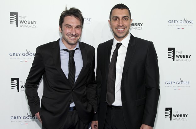 O Σον Ριντ, δεξιά και ο Τζόναθαν Μπαντίν, αριστερά, δυο εκ των ιδρυτών του Tinder, σε απονομή βραβείων το Μάιο του 2015. @2021 Andy Kropa/Invision/AP