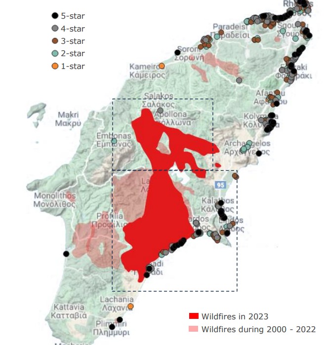 Η εταιρεία καταγράφει με κάθε λεπτομέρεια τι έγινε στη Ρόδο, εστιάζοντας στις τουριστικές υποδομές και τα όσα συνέβησαν και είχαν σχέση με τον τουρισμό. Όπως αναφέρει η μελέτη η Ρόδος επλήγη από μια καταστροφική πυρκαγιά, η οποία μαίνονταν το νησί για 10 ημέρες από τις 18 έως τις 27 Ιουλίου 2023 καταστρέφοντας έκταση που αντιστοιχεί στο 14,5% της συνολικής επιφάνειας του νησιού. Συνολικά κάηκαν 203 τετραγωνικά χιλιόμετρα, επηρεάζοντας σοβαρά τις τοπικές κοινωνίες και τον τουριστικό τομέα. Πιο αναλυτικά, τα χωριά Κιοτάρι, Πλημμίρι, Λάρδος, Λίνδος, Πεύκη και Βλυχά επλήγησαν σοβαρά αναγκάζοντας χιλιάδες ανθρώπους να απομακρυνθούν, στη μεγαλύτερη επιχείρηση εκκένωσης που έγινε ποτέ στην Ελλάδα, ενώ οι ισχυροί, μεταβαλλόμενοι άνεμοι ταλαιπώρησαν τις επιχειρήσεις πυρόσβεσης. Συνολικά περίπου 19.000 άνθρωποι, κυρίως τουρίστες, μεταφέρθηκαν σε ασφάλεια, εκ των οποίων 16.000 μέσω ξηράς και περίπου 3.000 δια θαλάσσης.