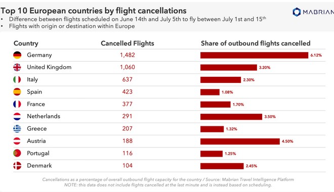 Το χάος στα αεροδρόμια της Ευρώπης με τις χιλιάδες ακυρωμένες πτήσεις, δεν φαίνεται να αφορά παρά ελάχιστα τη χώρα μας. Σύμφωνα με την έρευνα της Mabrian, η γερμανική αγορά επηρεάστηκε περισσότερο από το ποσοστό των συνολικών πτήσεων που ακυρώθηκαν. Τα δεδομένα της έρευνας συγκρίνουν τον αριθμό των προγραμματισμένων πτήσεων στις 14 Ιουνίου για πτήσεις μεταξύ 1ης και 15ης Ιουλίου, σε σχέση με τις συνολικές πτήσεις που είχε προγραμματίσει αρχικά ο προορισμός.