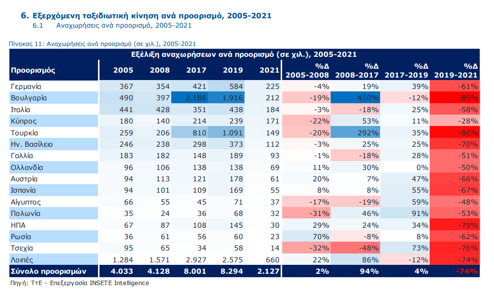 Σύμφωνα με τη μελέτη, την περίοδο 2005-2019 και κυρίως κατά την διάρκεια της οικονομικής κρίσης παρατηρείται μεταβολή των ταξιδιωτικών προτιμήσεων των Ελλήνων τουριστών με αύξηση των μεριδίων των όμορων φθηνών προορισμών της Βουλγαρίας και της Τουρκίας (από 19% το 2005 σε 36% το 2019) και μείωση των μεριδίων των παραδοσιακών υψηλότερης τουριστικής δαπάνης προορισμών της Γερμανίας, της Ιταλίας, της Ολλανδίας, της Γαλλίας και του Ην. Βασιλείου (από 33% το 2005 σε 21% το 2019). Η μείωση στα μερίδια που καταγράφεται στους παραδοσιακούς προορισμούς, οφείλεται σε μικρότερη αύξηση του εξερχόμενου τουρισμού και όχι σε μείωση τους. Η τάση αυτή μετά το 2019, διαταράσσεται λόγω της πανδημίας του κορονοϊού και των ταξιδιωτικών περιορισμών, καταγράφοντας το 2021 το χαμηλότερο αριθμό εξερχομένων τουριστών από την έναρξη της Έρευνας Συνόρων. Παράλληλα, το 2021, οι όμοροι προορισμοί της Βουλγαρίας και της Τουρκίας φαίνεται να επηρεάζονται σε υψηλότερο βαθμό από την πανδημική κρίση σε σύγκριση με τους παραδοσιακούς προορισμούς μας
