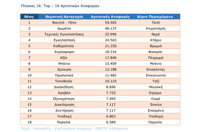 Στην πρώτη θέση με 55.000 αναφορές βρέθηκε η κατηγορία φαγητού-ποτού, με τις περισσότερες αρνητικές αναφορές να εμπεριέχουν τη λέξη-κλειδί ποτό. Ακολούθησε η κατηγορία δωματίου με αρνητικά σχόλια για το θέμα του «κλιματισμού» και αμέσως μετά ακολούθησε η κατηγορία των τεχνικών εγκαταστάσεων που είχαν σχέση με τη λέξη κλειδί «νερό». Οι αρνητικές αναφορές που περιείχαν τη λέξη νερό ανάφεραν συγκεκριμένα παγωμένο νερό στις πισίνες, ελλιπή καθαρισμό των πισίνων καθώς και έλλειψη ζεστού νερού στο μπάνιο κατά τη διαμονή.