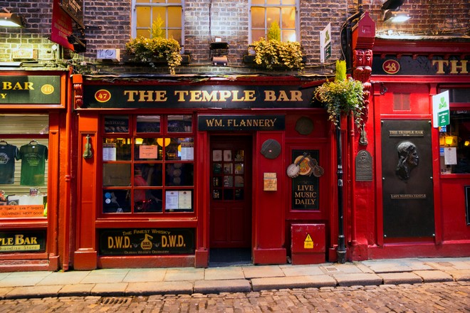 Και μιας και το ρίξαμε στο αλκοόλ, θα ήταν μεγάλη παράλειψη να μην αναφερθούμε στο Temple Bar. Το Temple Bar είναι μια περιοχή στο κέντρο της πόλης, στην οποία συγκεντρώνεται μεγάλο κομμάτι της νυχτερινής ζωής του Δουβλίνου κυρίως για τους τουρίστες, αλλά και για τους ντόπιους. Σε pubs όπως οι Palace Bar, The Temple Bar Pub, Oliver St. John Gogarty’s και The Auld Dubliner, μπορεί να πάρει κανείς μια πρώτη γεύση για τη νυχτερινή διασκέδαση των Ιρλανδών πίνοντας μπίρα και για το πόσο περισσότερο αλκοόλ από εμάς μπορούν να πιουν χωρίς να καταλάβουν τίποτα. Όποιος βρεθεί στο Δουβλίνο στις 17 Μαρτίου, την Saint Patrick’s Day, μπορεί να μην καταφέρει να φτάσει ποτέ μέχρι το Temple Bar, μιας και ο κόσμος θα έχει κατακλύσει την περιοχή από το μεσημέρι, ωστόσο ολόκληρη η ιρλανδική πρωτεύουσα μετατρέπεται εκείνη τη μέρα σε ένα τεράστιο Temple Bar, οπότε δεν μένει κανείς παραπονεμένος.