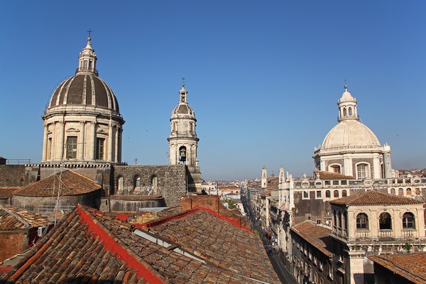 Η Κατάνια λοιπόν, βασανισμένη πόλη, έχει μεγάλη θέση στην καρδιά των Ιταλών. Η Αίτνα, ο ομφαλός της, το μεγάλο της ατού και ο χειρότερος εχθρός της, την κατέστρεψε τελευταία φορά το 1669. Παρόλα αυτά ο κεντρικός δρόμος λέγεται via Etna! Καταστράφηκε 9 φορές από σεισμούς, εκρήξεις, επιδρομές, ανοικοδομήθηκε 9 φορές και οι φήμες λένε ότι κάθε φορά είναι πιο όμορφη από πριν. Η σημερινή εκδοχή είναι αποτέλεσμα της τελευταίας δόμησης του 1693, όταν ένας σεισμός ισοπέδωσε την πόλη, και γι’ αυτό οι δρόμοι είναι μεγάλοι, χωρίς τα «μαφιόζικα» στενάκια του υπόλοιπου νησιού. Όμως η Κατάνια έχει επικρατήσει να λέγεται «Citta Nera» (Μαύρη πόλη) μια και η σκούρα λάβα του ηφαιστείου αποτέλεσε υλικό δόμησης.