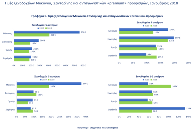 Σύμφωνα με τα τελευταία στατιστικά στοιχεία που έδωσε στην δημοσιότητα πριν από λίγες ημέρες το Ινστιτούτο του Σύνδεσμου Ελληνικών Τουριστικών Επιχειρήσεων (INΣΕΤΕ) η μέση τιμή ενός δωματίου σε ξενοδοχείων Πέντε Αστέρων στην Μύκονο τον Ιανουάριο του 2019 εκτοξεύθηκε στα 758 ευρώ η διανυκτέρευση από 408 ευρώ που ήταν πέρυσι.