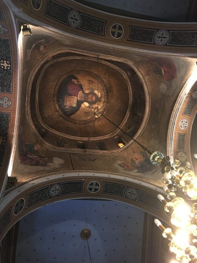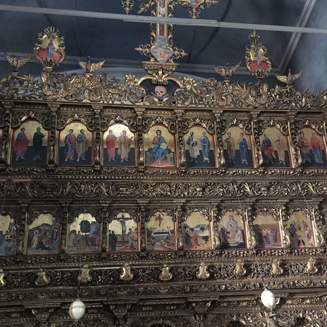 Εκείνος είχε φιλοτεχνήσει στο κέντρο την Παναγία Μυρτιώτισσα, με κυματιστές μορφές αγγέλων να την περιβάλλουν, ενώ δίπλα της βρίσκονται ο Άγιος Παντελεήμων, n Αγία Καλλιόπη, n Αγία Φιλοθέη, ο Άγιος Γεώργιος, ο Άγιος Δημήτριος αλλά και n Αγία Βαρβάρα.