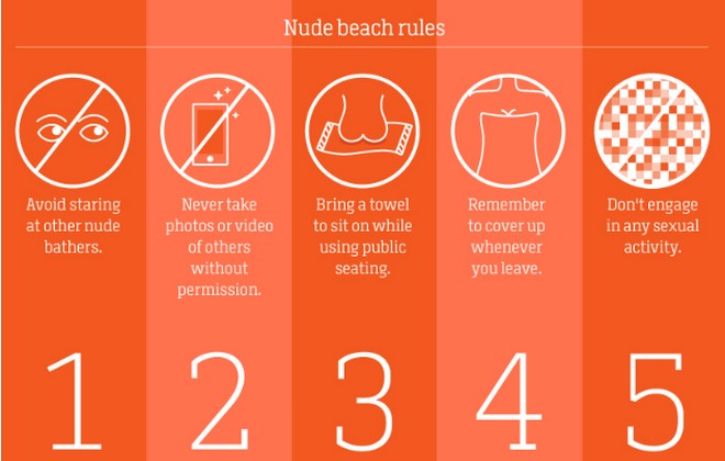 Απαγορεύεται να καρφώνεις το βλέμμα σου σε άλλους γυμνιστές, να φωτογραφίζεις ή να βιντεοσκοπείς άλλους, χωρίς άδεια, να κάνεις σεξ, οφείλεις να έχεις μαζί σου μια πετσέτα και να την εναποθέτεις στην άμμο, την καρέκλα ή όπου αλλού καθίσεις δημοσίως, να καλύπτεσαι όταν φεύγεις.