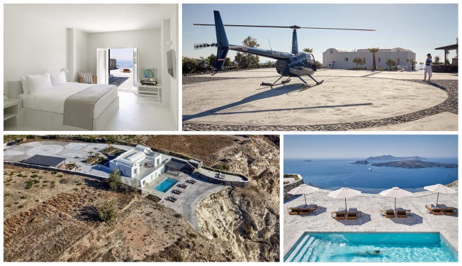 Στην κορυφή της λίστας είναι μια βίλα, πέντε υπνοδωματίων και 5 μπάνιων (360 τετραγωνικών μέτρων), στο Μεγαλοχώρι της Σαντορίνης. Όπως μπορείτε να δείτε, η ιδιοκτησία φτάνει έως το χείλος του γκρεμού. Φυσικά και έχει πισίνα, όπως φυσικά και τα δωμάτια έχουν θέα τη θάλασσα. Υπάρχει και ελικοδρόμιο. Η φιλοσοφία της διακόσμησης είναι “less is more, ώστε να χαλαρώνουν οι καλεσμένοι και να απολαμβάνουν τη μοναδική ομορφιά αυτού του μοναδικού μέρους”. Η τιμή του είναι στα 8.153 δολάρια η διανυκτέρευση. Δεν επιτρέπονται τα κατοικίδια και το κάπνισμα.