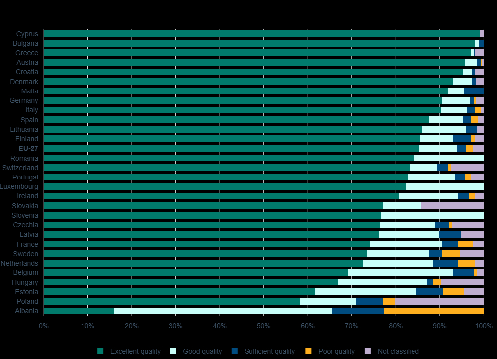 Στη χώρα μας ως εξαιρετικό χαρακτηρίστηκε το 97% των περιπτώσεων σε 1.685 σημεία και σε 10.423 δείγματα που εξετάστηκαν. Δηλαδή, 1677 σημεία. Καλή ήταν σε 15 σημεία, επαρκές σε 1 και φτωχό σε 1. Δεν κατηγοριοποιήθηκαν 35 σημεία.