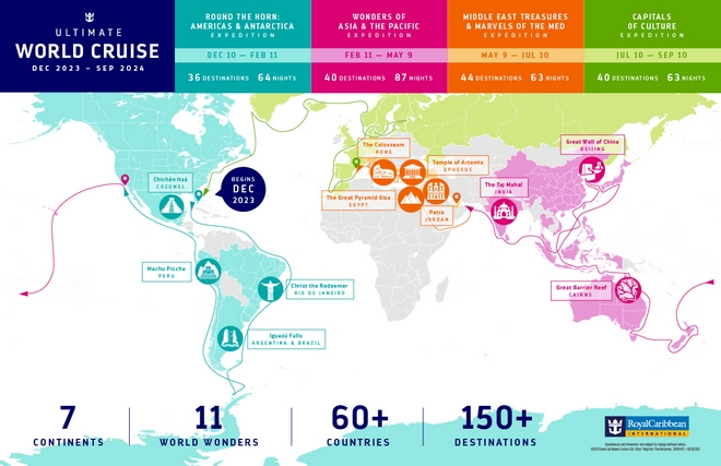 Μια περιπέτεια που θα διαρκέσει 274 νύχτες, ένα ταξίδι μοναδικό ετοίμασε η εταιρεία κρουαζιέρας Royal Caribbean για το 2023. Πρόκειται για μια κρουαζιέρα που γίνεται πρώτη φορά, ονομάστηκε Ultimate World Cruise και θα πραγματοποιηθεί με το πολυτελές πλοίο Serenade of the Seas, το οποίο θα ξεκινήσει από το λιμάνι του Μαϊάμι στις 10 Δεκεμβρίου του 2023 και θα επιστρέψει στις 10 Σεπτεμβρίου του 2024. Το δρομολόγιο, που όμοιο του δεν έχει ξαναγίνει, περιλαμβάνει και τις επτά ηπείρους, περισσότερους από 150 προορισμούς σε 65 χώρες και 11 μεγάλα θαύματα του κόσμου.