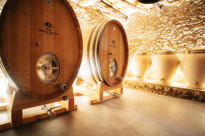 Τα αναστηλωμένα κτήρια του Κτήματος, χτισμένα από πέτρα, χρησιμοποιούνται πλέον για την οινοποίηση ορισμένων κρασιών. Δύο τεράστια παλιά πατητήρια γεμίζουν και πάλι με μούστο για ιδιαίτερες οινοποιήσεις, ενώ κομψοί ξύλινοι οινοποιητές χρησιμοποιούνται για ζυμώσεις. Ένας ιδιαίτερα προσεγμένος χώρος γευσιγνωσίας είναι διαθέσιμος στο κοινό, με μια κεντρική σάλα με μοναστηριακό τραπέζι καθώς και μια υπέροχη βεράντα με μαγευτική θέα. Και όλα αυτά μπροστά στο θρυλικό Μεγάλο Αμπέλι!
