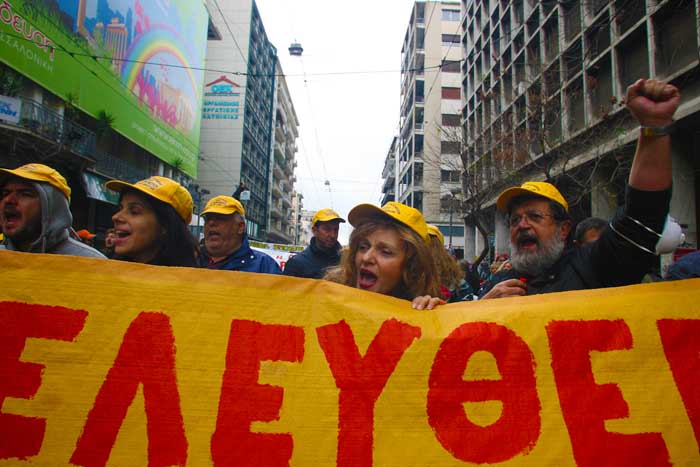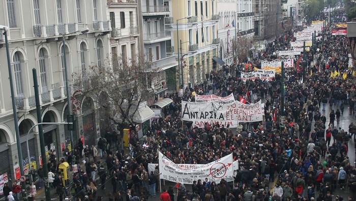 Πάνω από 25.000 εργαζόμενοι κάθε ηλικίας αψήφησαν το τσουχτερό κρύο και τη βροχή και διαδήλωσαν στην Αθήνα ενάντια στην επέμβαση στα εργασιακά δικαιώματα και την περικοπή μισθών στον ιδιωτικό και τον δημόσιο τομέα από την κυβέρνηση.