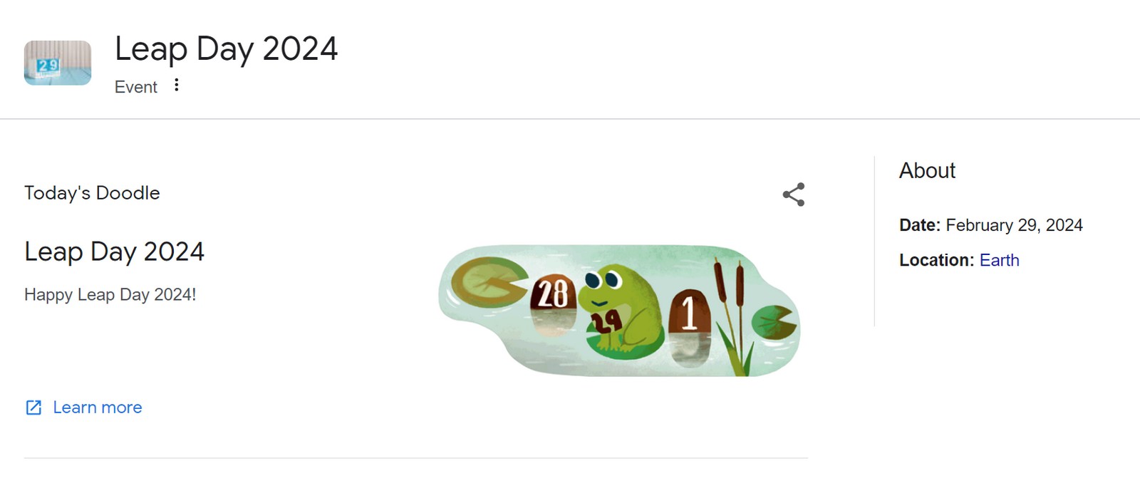 Στα αγγλικά, η σημερινή μέρα ονομάζεται Leap Day, με το doodle της Google να παρουσιάζει έναν βάτραχο που πηδάει. Όπως αναφέρεται: