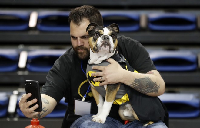 Erin Carlo, of West Des Moines, Iowa, takes a photo with his bulldog Charlie during the 38th annual Drake Relays Beautiful Bulldog Contest, Sunday, April 23, 2017, in Des Moines, Iowa. The pageant kicks off the Drake Relays festivities at Drake University where a bulldog is the mascot. (AP Photo/Charlie Neibergall) AP