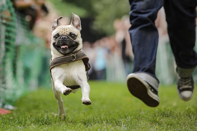 A pug races together with his owner during the pug race at the 8th International Pug Meeting in Berlin, Germany, Saturday, Aug. 19, 2017. (Gregor Fischer/dpa via AP) AP