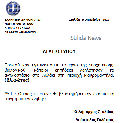 Εγκαίνια ετοιμαζόταν να κάνει ο Δήμαρχος Στυλίδας, Απόστολος Γκλέτσος, όταν άγνωστοι εισέβαλαν στις εγκαταστάσεις του ‘βιολογικού – αποχετευτικού στο Αυλάκι στην περιοχή Μαυρομαντήλα και έσπασαν ότι βρήκαν μπροστά τους. Η οργισμένη ανακοίνωση του Δημάρχου ωστόσο ήταν εκείνη που έκανε το γύρο των social media.