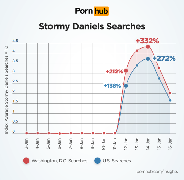 Όλα ξεκίνησαν όταν το μέσο Newsweek, επικοινώνησε με τον πάροχο πορνό ταινιών, προκειμένου να ρωτήσει ακριβώς αυτό. Τα στατιστικά του Pornhub ήταν αποκαλυπτικό. Η αγαπημένη κυρία, έχαιρε της αναζήτησης 2,500 χρηστών την ημέρα, ώσπου σε μόλις 5 ημέρες, αυτές άγγιξαν τα 2 εκατομμύρια. Σε παγκόσμιο επίπεδο η αναζήτηση έφτασε στο +375%, ενώ ακόμη πιο ψηλά ήταν η ποσοστιαία εκτίναξη στην πρωτεύουσα των ΗΠΑ, την Ουάσινγκτον.