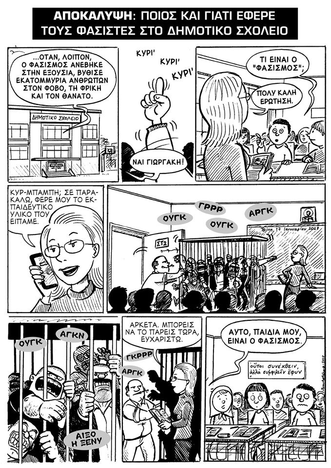 Το σημερινό του κόμικ καταπιάνεται με τη ρατσιστική επίθεση μελών της Χρυσής Αυγής εναντίον δασκάλων στο δημοτικό του Περάματος, οι οποίοι δέχθηκαν προσφυγόπουλα για να φοιτήσουν στις τάξεις του σχολείου.