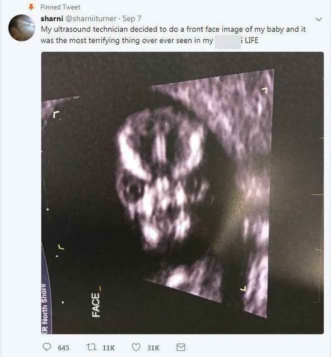 Η Sharni είδε σε αυτό την αστεία πλευρά και έγραψε στο twitter: “Ο τεχνικός για τον υπέρηχο αποφάσισε να βγάλει τραβήξει μία ανφάς εικονα του μωρού μου και ήταν το πιο τρομακτικό πράγμα που έχω δει στη ζωή μου!”.