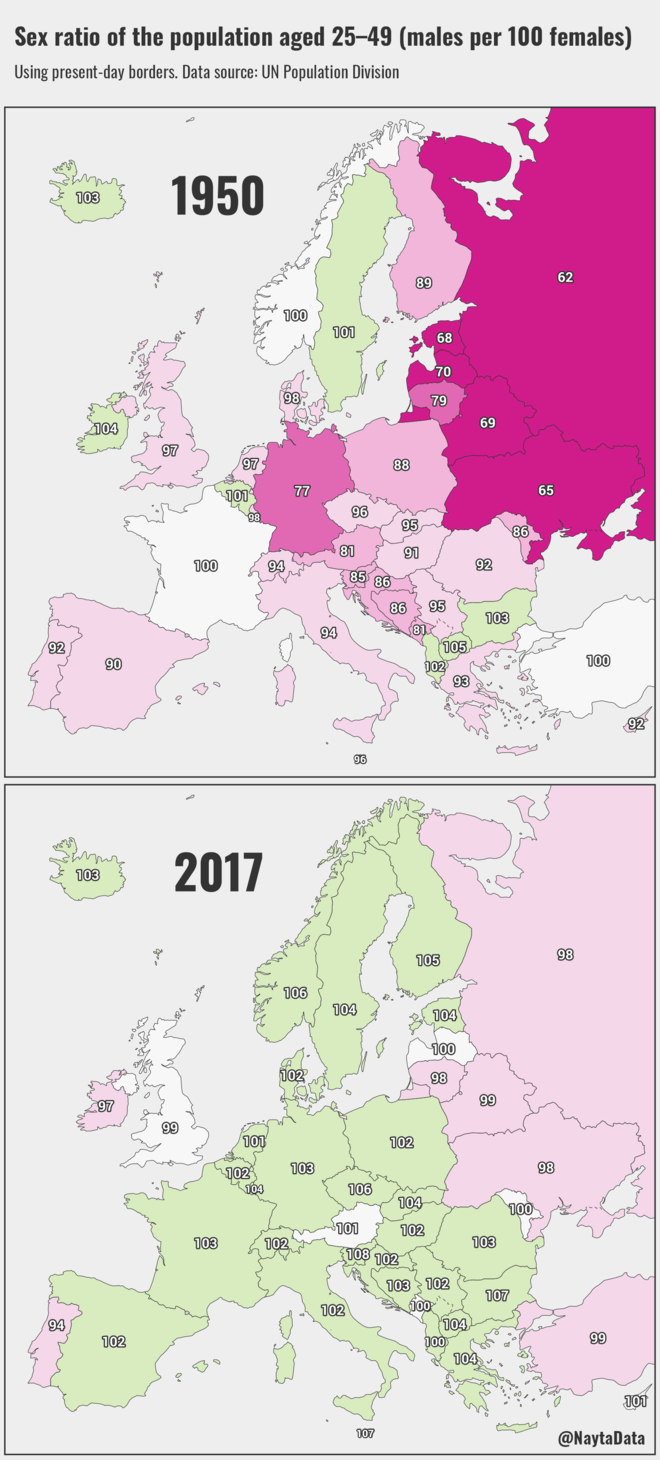 Οι τιμές στους δύο χάρτες δείχνουν το πόσοι άνδρες αντιστοιχούσαν ανά εκατό γυναίκες το μακρινό 1950 στην Ευρώπη και αντίστοιχα και σήμερα στις ηλικίες, επαναλαμβάνουμε 25 – 49 ετών. Έτσι στον πρώτο χάρτη ο οποίος είναι ελάχιστα χρόνια μετά το τέλος του Β’ Παγκοσμίου Πολέμου βλέπουμε ότι στις δύο χώρες που πρωταγωνίστησαν στα πεδία των μαχών το ισοζύγιο να είναι σαφές υπερ των γυναικών. Στην μεν (σ.σ. τότε) Σοβιετική Ένωση για κάθε 100 γυναίκες αντιστοιχούσαν μόλις 62 άνδρες στην δε Γερμανία 77. Η Ελλάδα που από τον συγκεκριμένο πόλεμο βγήκε με υπερβολικά πολλούς νεκρούς αλλά για άλλους λόγους, για κάθε 100 Ελληνίδες στις συγκεκριμένες ηλικίες αντιστοιχούσαν 93 Έλληνες.