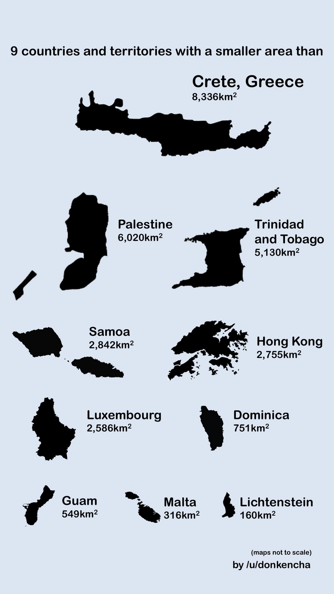 Πριν από λίγες ημέρες ο χρήστης donkencha στο reddit δημιούργησε ένα infographic όπου συγκρίνει την Κρήτη με εννέα χώρες και περιοχές που είναι μικρότερες από το ελληνικό νησί.