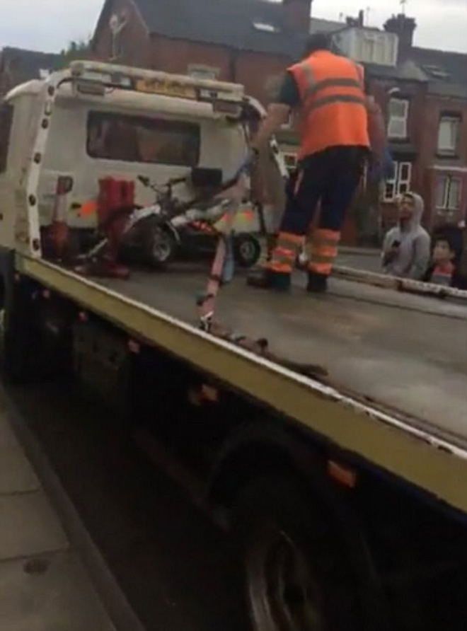 Βρετανοί αστυνομικοί κατάσχεσαν και φόρτωσαν σε γερανό το μικροσκοπικό ποδήλατο, αφότου συνέλαβαν τον 17χρονο ιδιοκτήτη του για κλοπές αυτοκινήτων