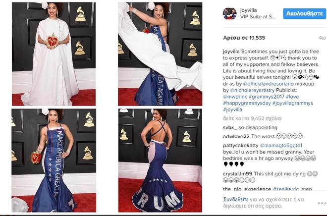 Η Joy Villa εμφανίστηκε στο κόκκινο χαλί των Grammy με ένα φόρεμα που ανέγραφε πάνω του το προεκλογικό σύνθημα του Ντόναλντ Τραμπ (Pics)