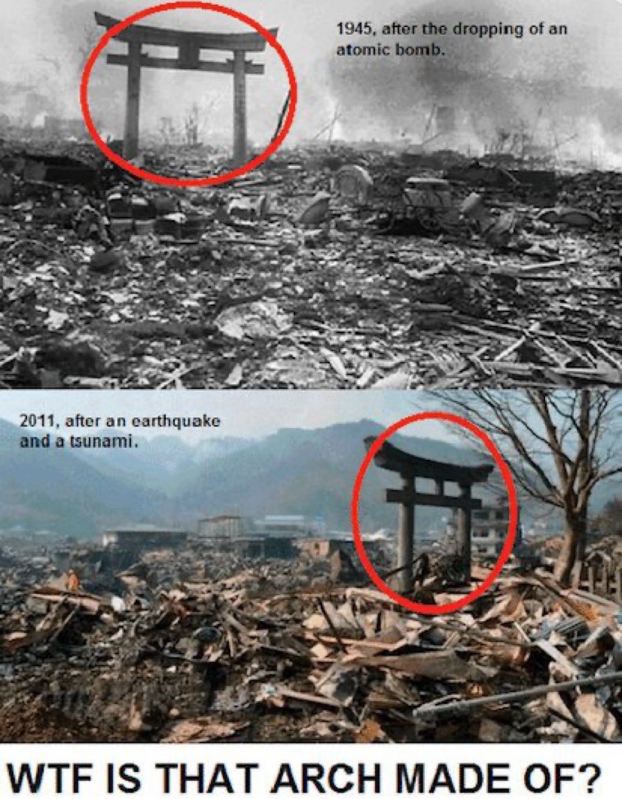 Κάποιος χρήστης επανέφερε το ερώτημα που έχει τεθεί και στο παρελθόν, πώς γίνεται δηλαδή μια τέτοια αψίδα να έχει επιβιώσει από την ατομική βόμβα του 1945, αλλά και από το τσουνάμι του 2011. Στην ανάρτησή του που αναδημοσιεύθηκε στο non aesthetic things, δεν αποσαφηνίζεται αν πρόκειται για την ίδια αψίδα, κάτι που πυροδότησε θεωρίες συνωμοσίας. Σημειώνεται εδώ πως οι ατομικές βόμβες επανήλθαν στις δημόσιες συζητήσεις λόγω του Οπενχάιμερ που αυτό το διάστημα παίζεται στους κινηματογράφους.