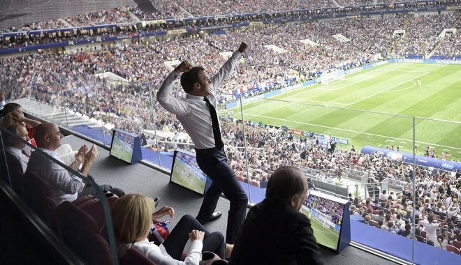 Ο Γάλλος πρόεδρος παρακολούθησε τον μεγάλο τελικό δίπλα στη σύζυγό του, Μπριζίτ, και την πρόεδρο της Κροατίας, Κολίντα Γκράμπαρ-Κιτάροβιτς και όπως φαίνεται κι από τη φωτογραφία, έζησε την κάθε στιγμή με τον ενθουσιασμό μικρού παιδιού: Στο τελευταίο γκολ της Εθνικής Γαλλίας, σκαρφάλωσε σχεδόν στα θεωρεία των επισήμων.