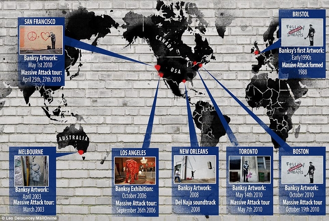 Η Daily Mail έφτιαξε και τον παρακάτω χάρτη που δείχνει τον χρονικό συσχετισμό της πορείας του Banksy και των Massive Attack: