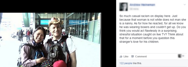 Πολλοί, βλέποντας το βίντεο που “έπαιξε” στο Facebook και στο Twitter χωρίς περαιτέρω πληροφορίες για το ποιος είναι ο καλεσμένος του BBC και κυρίως, πού βρίσκεται, σχολίασαν πως η εν λόγω γυναίκα είναι η νταντά, ή η υπηρέτρια του σπιτιού, κρίνοντας από την ασιατική της εμφάνιση. Η αλήθεια είναι όμως, πως πρόκειται για τη γυναίκα του καθηγητή, νοτιοκορεατικής καταγωγής.