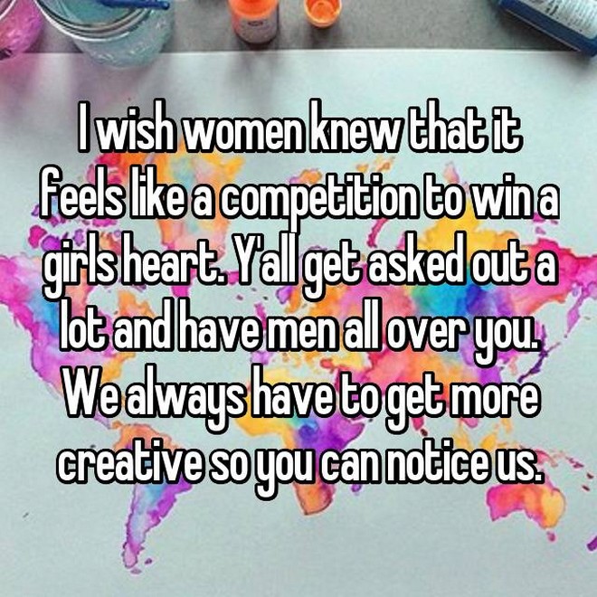 Εύχομαι οι γυναίκες να ήξεραν ότι είναι αγώνας να κερδίσεις την καρδιά μιας κοπέλας. Όλες σας δέχεστε προσκλήσεις για εξόδους και έχετε άνδρες γύρω σας. Εμείς πρέπει να γίνουμε πιο δημιουργικοί, ώστε να μας προσέξετε.