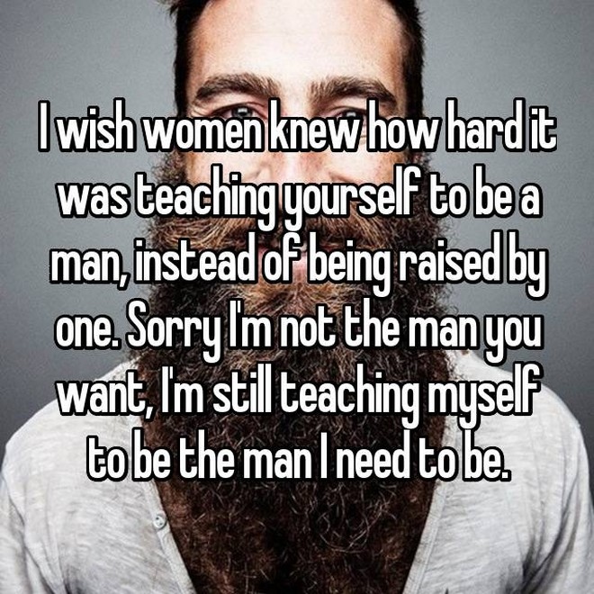 Εύχομαι οι γυναίκες να ήξεραν πόσο δύσκολο είναι να διδάσκεις τον εαυτό σου να γίνει άνδρας, αντί του να σε μεγαλώσει ένας άνδρας. Συγγνώμη που δεν είμαι αυτός που θέλετε. Ακόμα διδάσκω τον εαυτό μου να γίνει ο άνδρας που χρειάζομαι να είμαι.