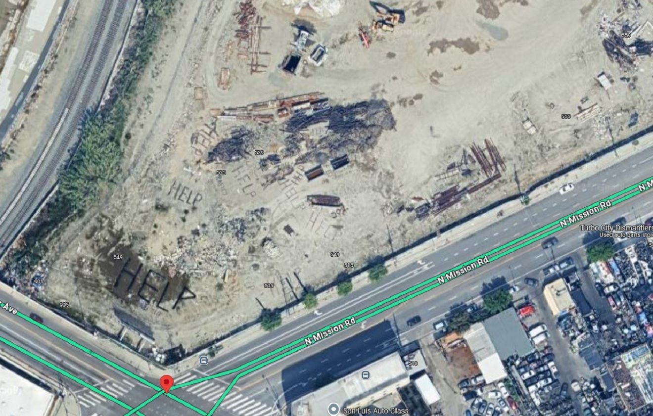 Συγκεκριμένα, στις δορυφορικές φωτογραφίες -οι οποίες φέρεται να χρονολογούνται από το 2023- όπως μπορείτε να δείτε και παρακάτω, διακρίνονται οι λέξεις “Help”, “Traffico”, “Federal”, “LAPD” και “FBI” γραμμένες πάνω σε συντρίμμια και πεταμένα αντικείμενα σε μια περιοχή που θυμίζει σκουπιδότοπο.