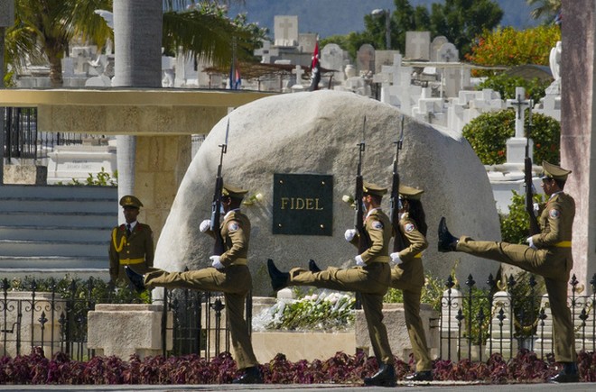 An honor guard marches in front of Fidel Castro's tomb at the Santa Ifigenia cemetery in Santiago, Cuba, Sunday, Dec. 4, 2016. Fidel Castro's ashes were interred in a private ceremony Sunday morning, ending nine days of mourning for the man who ruled Cuba for nearly half a century.(AP Photo/Ramon Espinosa) AP