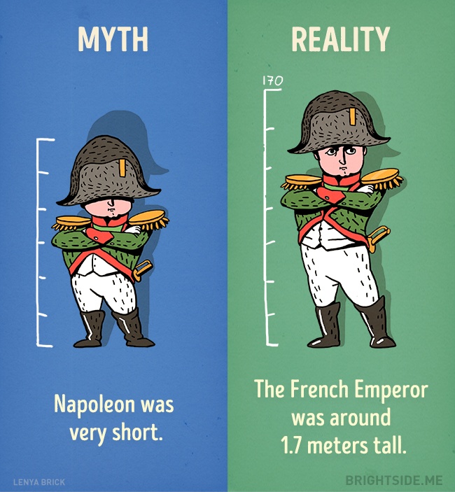 Ο Ναπολέων ήταν πολύ κοντός. Στην πραγματικότητα ο Γάλλος αυτοκράτορας είχε ένα μέτριο ανάστημα, κανονικό με το μέσο ύψος των ανθρώπων της εποχής. Συγκεκριμένα, ο Ναπολέων είχε ύψος 1.70.