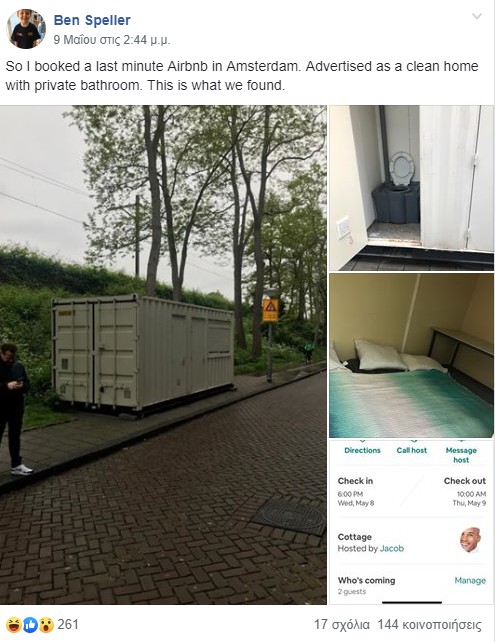 Όπως δήλωσε σε ολλανδικό ενημερωτικό δίκτυο, έκλεισε ένα Airbnb “διαμέρισμα” για 100 λίρες τη βραδιά. Ο ιδιοκτήτης ενημέρωνε βέβαια πως δεν υπήρχε τρεχούμενο νερό αλλά όταν ο τουρίστας έφτασε στην περιοχή Pauwenpad, συνειδητοποίησε πως είχε “κλείσει” ένα κοντέινερ μέσα στο οποίο υπήρχε μια χημική τουαλέτα.
