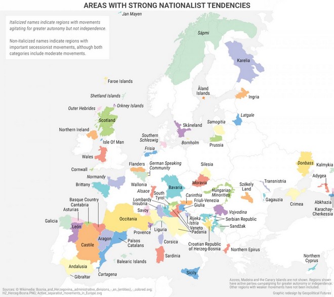 Τον έντονο εθνικισμό της Ευρώπης και την τάση για να απόσχιση ορισμένων περιχών από τα κράτη στα οποία ανήκουν καταγράφει ο παρακάτω χάρτης.