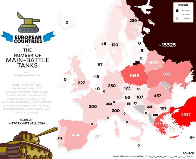 Μια σχετική, νέα απεικόνιση σε χάρτη, δημιούργησε η σελίδα History in a Nutshell, παρακάτω. Η απεικόνιση βασίζεται σε στοιχεία που περιλαμβάνονται στο άρθρο της Wikipedia List of main battle tanks by country το οποίο ανανεώνεται ανά τακτά χρονικά διαστήματα και αντλεί με τη σειρά του στοιχεία από το armedforces.eu (μεταξύ άλλων πηγών). Περιλαμβάνεται η Ρωσία. Καταγράφονται τα τανκς που είναι μάχιμα μαζί με εκείνα που είναι σε συντήρηση.