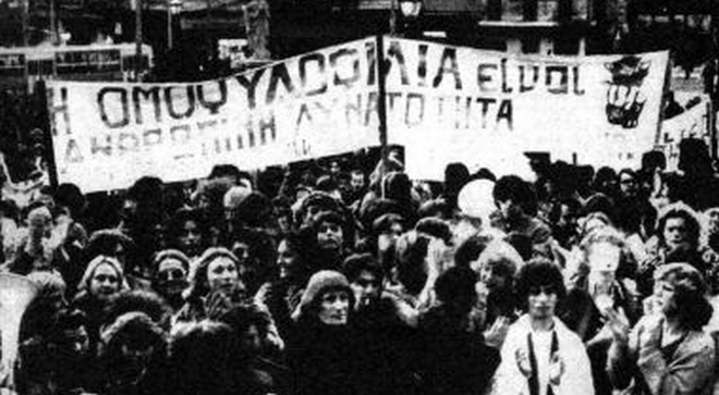 Αποφασίστηκε να γίνει συγκέντρωση στα Προπύλαια, πορεία διαμαρτυρίας στο κέντρο της Αθήνας και από εκεί με πούλμαν στο Καστρί, στην πρωθυπουργική κατοικία. Μερικοί ομοφυλόφιλοι (το gay το άκουγες σπάνια στην Ελλάδα τότε, στις ταινίες οι υπότιτλοι έγραφαν πάντα “αδερφή”, το μόνο παλιό και σταθερό ήταν το λεσβία), δεσμεύτηκαν να συμμετάσχουν. Εγώ δεν είπα τίποτα. Ο Μπάμπης με κοίταξε και με ρώτησε στα ίσια αν θα πήγαινα στην πορεία. (…) Ξέροντας ότι ο αλεξιπτωτιστής πάντα χρειάζεται μια καλή κλωτσιά στον πισινό για το πρώτο, το ουσιαστικό “πήδημα”, δέχτηκα την πρόσκληση – ερώτηση του Μπάμπη.
