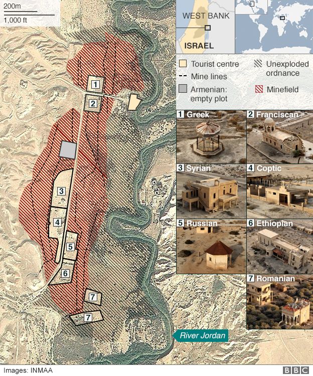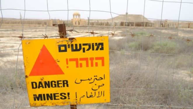 Το έδαφος είναι γεμάτο νάρκες που παραμένουν από «τον πόλεμο των 6 ημερών», δηλαδή τον πόλεμο μεταξύ του Ισραήλ και της Αιγύπτου, της Συρίας και της Ιορδανίας, που έληξε με θρίαμβο των Ισραηλινών που τριπλασίασαν τα εδάφη τους το 1967. Έκτοτε, η ιερή περιοχή παραμένει εγκλωβισμένη μέσα στις χιλιάδες νάρκες που μπορούν ανά πάσα στιγμή να προκαλέσουν ακόμη μεγαλύτερη ζημιά στις χριστιανικές εκκλησίες. Είναι όλες χτισμένες την εποχή του Βυζαντίου, ανάμεσά τους και μία ελληνική. Πάνω από 300.000 πιστοί κάνουν το επικίνδυνο ταξίδι κάθε χρόνο με σκοπό να βαφτιστούν στον Ιορδάνη ποταμό.